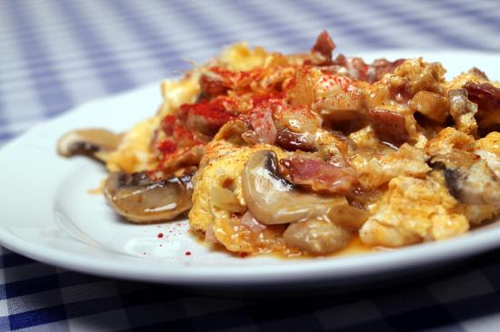 ( 3 tojásból ) szalonna,hagyma,sonka,kolbász,gomba, krumpli, sajt